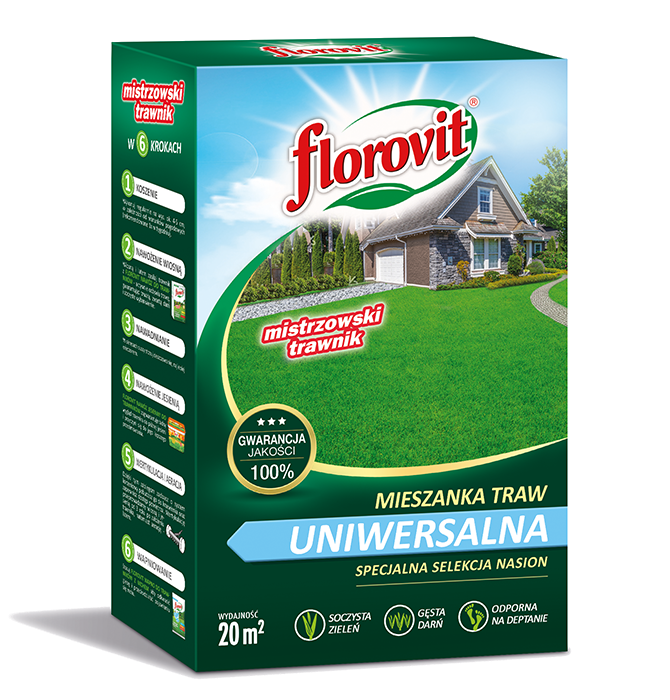 Florovit MIESZANKA TRAW UNIWERSALNA świetnie sprawdzi się w przydomowych ogrodach, działkach i wszędzie tam, gdzie trawnik to miejsce relaksu i wypoczynku. Specjalna selekcja nasion traw gazonowych, dopasowanych do polskich warunków klimatycznych gwarantuje uzyskanie pięknego trawnika o wysokich walorach estetycznych i użytkowych oraz dobrej mrozoodporności.